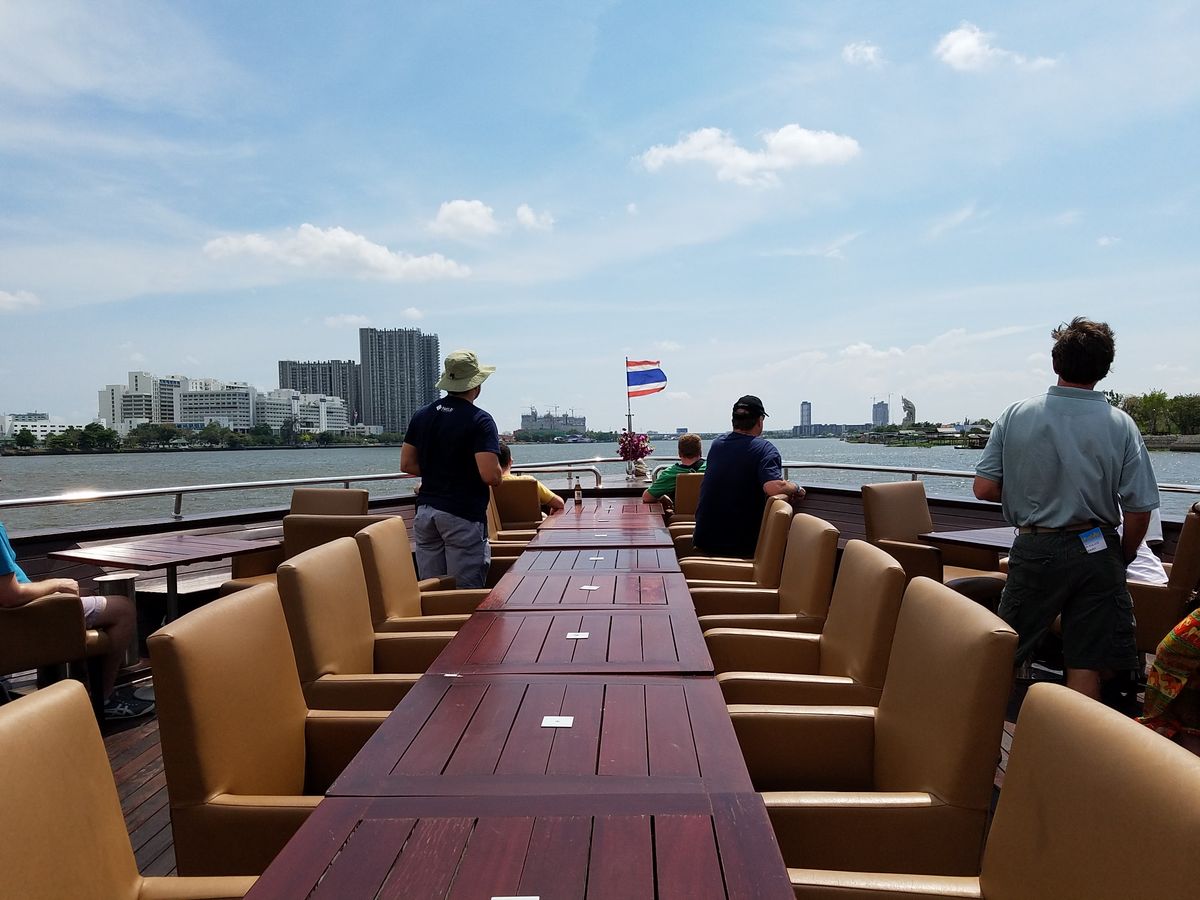 シーロムのホテルからタクシーで行きましたが、渋滞と受付場所を見つけるのに時間がかかりましたので、余裕を持って向かった方がいいです。約2時間のクルーズですが、日中巡ったワット・アルンやワット・プラケオなどの姿が浮かび上がり、また大都会バンコクの美しい夜景が堪能できました。バイキング形式の食事も美味しく、終始音楽の演奏が素晴らしかったです。選曲がよく、サックスの演奏は抜群で、音楽を聴きながら心地よい夜風を切るクルーズは最高です。最後にみんなで踊るダンスパーティーは、国際色豊かなフレンドリーのひとときでした。料金もリーズナブルで参加してよかったです。とても良い思い出になりました。