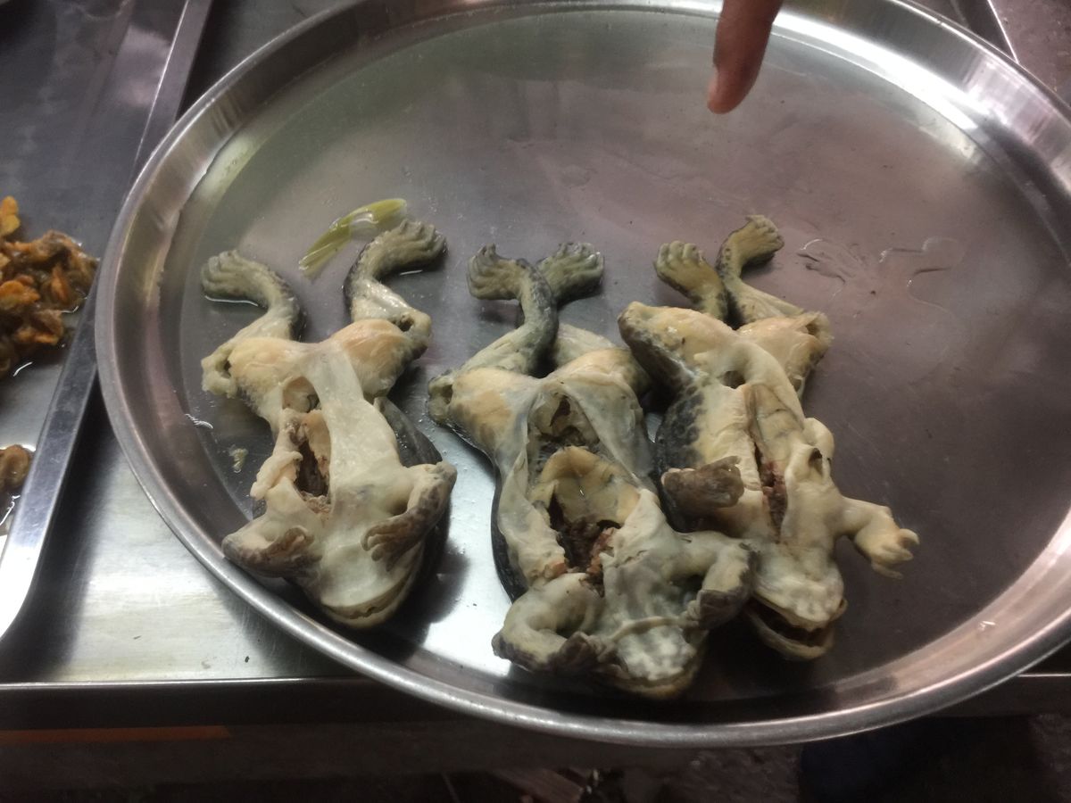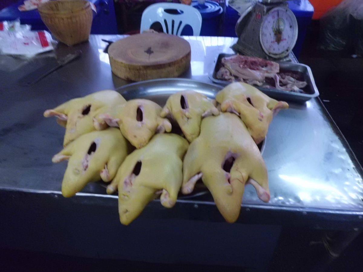 ローカル市場朝市へ行きます。市場には、ナマズや食用カエル(ぴょんぴょん跳ねてました)や果物、お菓子から日用品までいろいろ売っています。市場のおばさん達は愛想がよくカメラを向けるとアヒルを持ってポーズをとってくれました。ガイドさんがお菓子や果物を味見させてくれ、現地の味が楽しめたり初めて見る物があったりと楽しかったです。