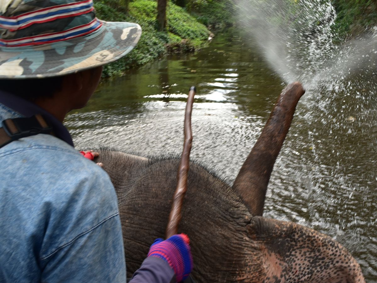 最後にメインの像乗りですが、私達家族は4人で参加したので娘3人が一緒で、私は他の方と2人で小象に乗りましたが、小象ちゃんに気の毒で、川に入る時に顔が水に浸かってイヤがりながらも象使いのおじさんに誘導されしぶしぶ入っていき途中、苦しくなったのか?噴水の様に鼻から水しぶきが上がりました。