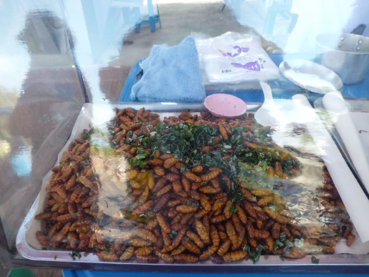 カオヤイへ向かう途中に、ガソリンスタンドに立ち寄り、トイレ休憩ですが、コンビニも有り朝食などが買えます。コンビニ前で虫の炒め物が販売されておりガイドさんからチャレンジしてみてと言われ、人生初の幼虫を食べましたが思っていたよりは、不味くはなかったかな?