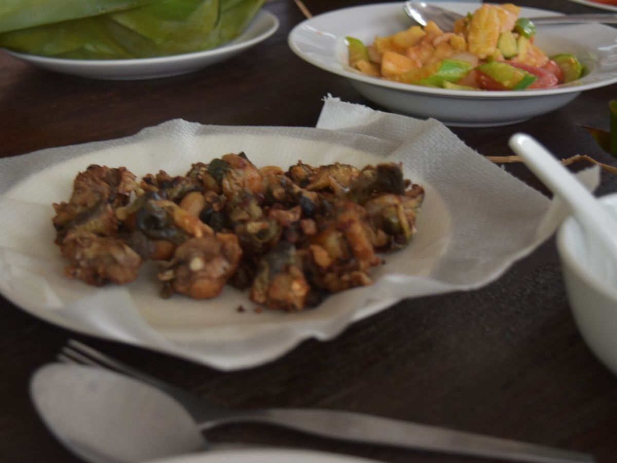 市場でカエルにトライするか?といわれてトライする。と答えたらランチで唐揚げとしてでてきました。軟骨みたいでとても美味しいです。