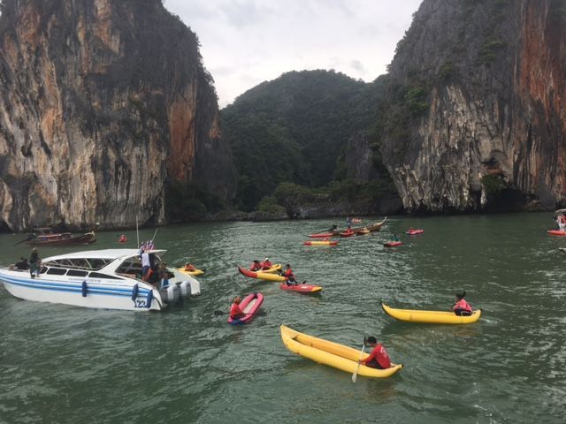 プーケットのダウンタウンから、相当北東へ移動します。早朝のピックアップから道路が混んでいたらば、2時間近く出発する港に行くまでかかることも覚悟してください。船も大きな船でスピードは遅いです。アクティビティについては、洞窟探索などワクワクするポイントもありますが、全体的な印象は、同じシーカヤックであればパラオの方が良かったと感じました。