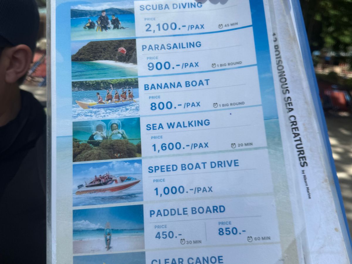 カイ島はかなり商業ベースの島です。パラソルを使用するために要ワンドリンク、甘いアイスコーヒー200バーツします。ジェットスキーは1人1000バーツでした。