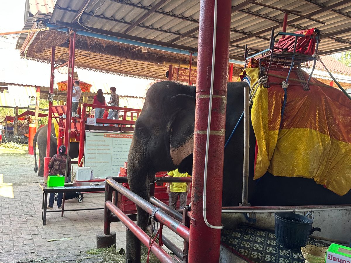 アユタヤの象さんはお化粧をされていて、背中の席には歴史を感じさせるパラソルも付いていて、そんな象さんに乗って遺跡の街を歩いてもらうのはとても良さそうでした。