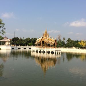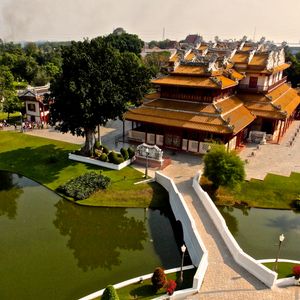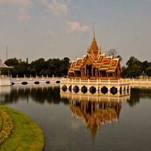 バンコクを朝7時過ぎに出発した6人のツアーは8時30分には最初の観光スポットバンパイン離宮に到着した。水と緑豊かな閑静な朝の佇まいに清新な気分になった。ブーゲンビリアとプルメリアの花が導くエントランスには鳥の声も多く聞こえる。水に浮かぶように立つ離宮はタイ建築様式の優雅な姿を水にも映し、飽きずに眺められる。拝殿は中国様式の建築で内部は赤く塗られ数々の彫刻があしらわれ見事である。その他庭園を見渡せる塔、樹木を動物の形に刈り込んだものなど緑美しく心和む空間が広がっていた。
