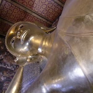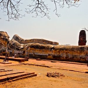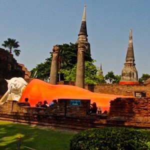 ここの涅槃仏はアユタヤ最大のもので訪れたときは布がなく、石はだが自然なグレレー色で入り交じっていて、かえって穏やかな雰囲気であった。足の裏の高さだけでも3m以上あるだろうか。周りの建築物はほとんど残ってない。遺構が点在するのみである。タイはビルマとの24回にも及ぶ永く苦しい戦争がつづき遺跡もかなり破壊されたという。戦いには象も使われた時代があったと聞く。人と象との関わりを考えるとき、宮沢賢治の「オツベルと象」を思い出していた。