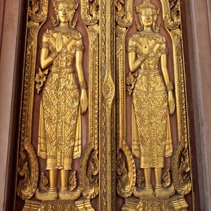 次に訪れたのは高さ72mの見上げるばかりの勝利記念の仏塔と周りに多くの座像仏が並んでいた。涅槃仏にも多くの人が蓮の蕾と線香をもってお参りしている。真っ白な仏像は真新しいオレンジの布を纏っている。ここは修復が終わり綺麗に整備されていて結婚式の正装姿のカップルが写真に収まっていた。寺院の中の仏像や急階段を登ってお参りする人で混み合っていたが裏手に回ると静かな感じで心が浄められた感じがする。壁のところには金のアプサラ風(アンコールワットに見られる)のレリーフ四体の像が美しい。若い僧や子どもの僧の歩く姿も日に焼け健康そうである。