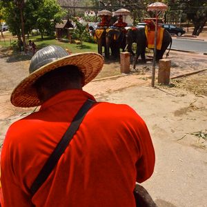 そんな訳で象を活用する象に乗る観光にはちょっと複雑な気持ちであった。それでも象乗りは初体験なので高い台の上から2人で乗り込んだ。座席に収まると安定感があり高さはあって揺れても恐怖感はない。池の近くの水飲み場までの往復約10分ほどのライディングであった。降りて話を聞くと象の数は減ってきているという。自然の中で過ごす象たちの環境はどうなっているのかまでは聞き逃した。出口には大きななべに象の餌のトウモロコシが置いてあった。
