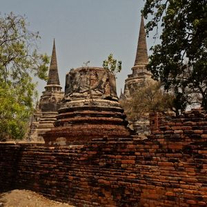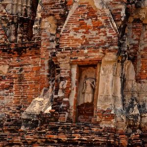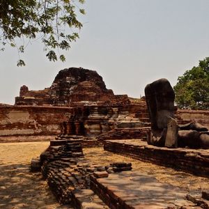 大きく傷ついた寺院の中央にはバンコクのワット・アルン(暁の寺)と同じデザインの塔があったという。今は下の部分しか残っていないが、周りの塔(傾いているのもある)の姿はアンコール遺跡に似通った感じのものが多いように思う。2011年の洪水で約10mも河の水位があがったという痕も残っている。今、観光の目玉は樹の根に埋もれている仏頭かもしれない。お参りするというより写真スポットの感があり騒々しい。遺跡の中を歩いていると頭部の失われた黒い仏像が並び異様な感じがする。一つの赤い煉瓦の塔の壁に白い立像があるのが目に入った。美しい釈迦の姿のようであるが頭と足が欠けているのは惜しい。優美さが感じられ私にはここがメインに思われた。