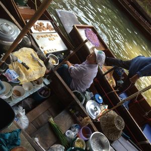 以前他の旅行会社を通してダムヌウサドアク水上マーケットに来たことがありましたが、こちらのツアーの方がお迎えのバスも涼しくてキレイで、ガイドさんも日本語が堪能で水上マーケット自体だけでは無くツアーの全てを通して楽しむことができました。ダムヌウサドアク水上マーケットくるのであれば、エンジンボートのみではなく手漕ぎボートにも乗った方が何倍も有意義な時間を過ごせると思います。手漕ぎボートにはガイドさんは同行されていませんでしたが、現地の船を漕いでくださった方がとても親切、そしてフレンドリーで困るようなことは無さそうでした。漕ぎ手の方に欲しいものを伝えるとすぐにそのお店に行ってくれたり、どうやって値段交渉をすれば良いかなど買い物の手伝いをしてくださったりしてとても楽しかったです。ただ、ガイドさんがおすすめしてくださる果物は水上マーケットで購入して食べるよりもバンコク市内のマーケットで購入したほうがだいぶ安くあがるので勧められたからといって買いすぎないようにしたほうがいいと思います。水上マーケットの雰囲気を楽しみながらフルーツを食べたいという方にはいいかもしれません。とても楽しかったです。ありがとうございました。