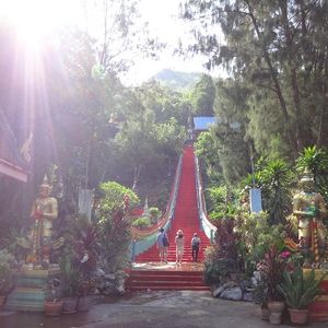 赤い長い階段を上った先に洞窟があり、洞窟内には仏像が安置されていました。洞窟内には裸足で入りました。洞窟内は蝙蝠の糞の臭いが強く、敏感な方には少し辛いかもしれません。奥にある洞窟トンネルは蛇が出るとのことで、案内されませんでした。ここではあまりガイドさんの説明がなく、もう少し説明があると良かったかなと思いました。階段上からは、カンチャナブリの山々が見え、景色がよかったです。