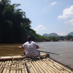 像トレッキングの場所から救命胴衣を貰って徒歩で移動しました。エンジンボートで上流まで上り、そこから手漕ぎでゆっくり下ります。穏やかな日差しの中、暖かい風と水の流れを受け、カンチャナブリの原生林を眺めながら進む川下りはとても気持ち良かったです。