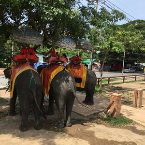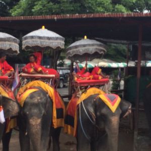 マイクロバスに乗って行きます。お客は12人、ガイドさん、運転手さんでした。満席でした。ガイドさん、とても親切で、あちこちで写真を撮ってくれました。象乗りは、知り合った別のグループの方と写真を撮り合い、後で送りました。象乗りのところでもカメラマンがいますが、写真はかなりの高額?だったと思います。暑い日だったので、アユタヤ観光は、かなりこたえました。脚を出している部分がジリジリしますので、長ズボンか日焼け止めをしっかり塗る必要があると思いました。