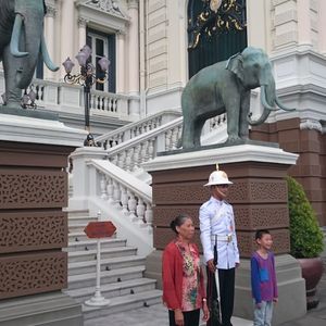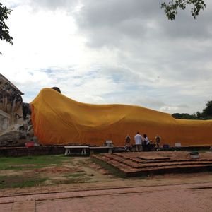 5月末、前日の水上マーケット観光ツアーの暑さから回復した早朝6時、同じようにホテルに集合してそのツアーは始まりました。その日は我々だけの貸切となり、やはり冷房の効いたワゴン車で北へ向かうこと1.5時間、まずはバンパイン宮殿で下車です。広い敷地の中をゆっくり歩いて観光しました。特筆すべきは、中国から取り寄せしたという象嵌が施された家具などの調度品。どれも贅を尽くした品々でした。その後涅槃像や寺院、木の根に抱かれた仏様の頭などアユタヤの定番ともいえる観光地を足早に移動していきました。途中象の背中に揺られ市街地を散策。象の背中は意外と高いんだという驚きがありましたが、それよりも揺れがひどく乗り物酔いになりそうになり、最後は早く降りたい気分でした。