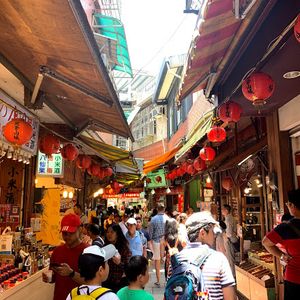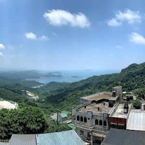 その後は九份へ。十分からは50分ほどで着きました。九份は入口が2か所あって、基山街(昼食が先)か豎崎路(茶屋が先)か、どちらから行くかを尋ねられ、お腹が空いていたので基山街の方から行きました。簡単な地図をもらって、集合場所の駐車場までの写真をLINEで送ってくれたので、迷うことはありませんでした。約2時間フリータイムでした。梅雨が明けて晴天に恵まれ、展望デッキからは景色が一望できましたが、暑さと人込みで、子供たちが疲れてしまって、30分ほど早めに切り上げて駐車場へ戻りました。ここでも冷たいお絞りのサービスがありました。
