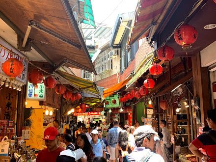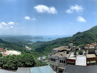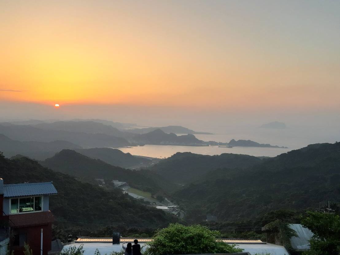 その後は九份へ。十分からは50分ほどで着きました。九份は入口が2か所あって、基山街(昼食が先)か豎崎路(茶屋が先)か、どちらから行くかを尋ねられ、お腹が空いていたので基山街の方から行きました。簡単な地図をもらって、集合場所の駐車場までの写真をLINEで送ってくれたので、迷うことはありませんでした。約2時間フリータイムでした。梅雨が明けて晴天に恵まれ、展望デッキからは景色が一望できましたが、暑さと人込みで、子供たちが疲れてしまって、30分ほど早めに切り上げて駐車場へ戻りました。ここでも冷たいお絞りのサービスがありました。