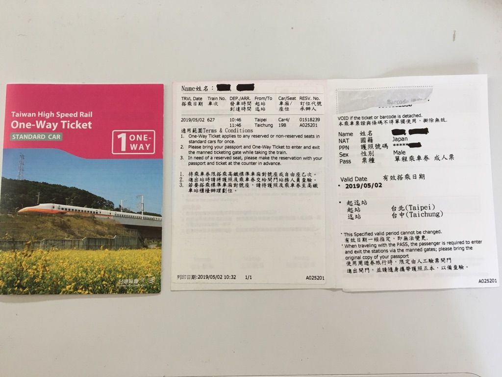 乗車当日に台北駅の窓口で、プリントしたチケットとパスポートを渡すだけで、新幹線の乗車券(写真)にしてくれました。