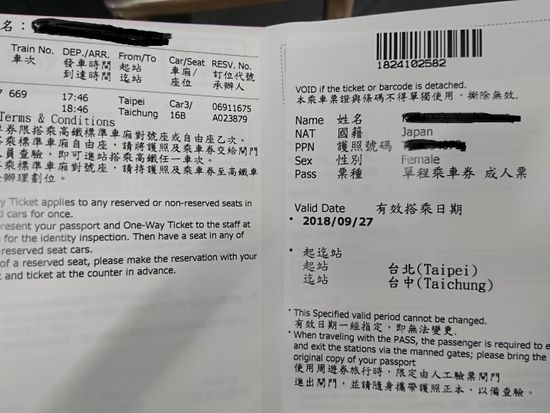 台北⇔台中間で帰りの日にちが決まっていたので、台北駅で復路のチケットも予約し発行してもらいました。