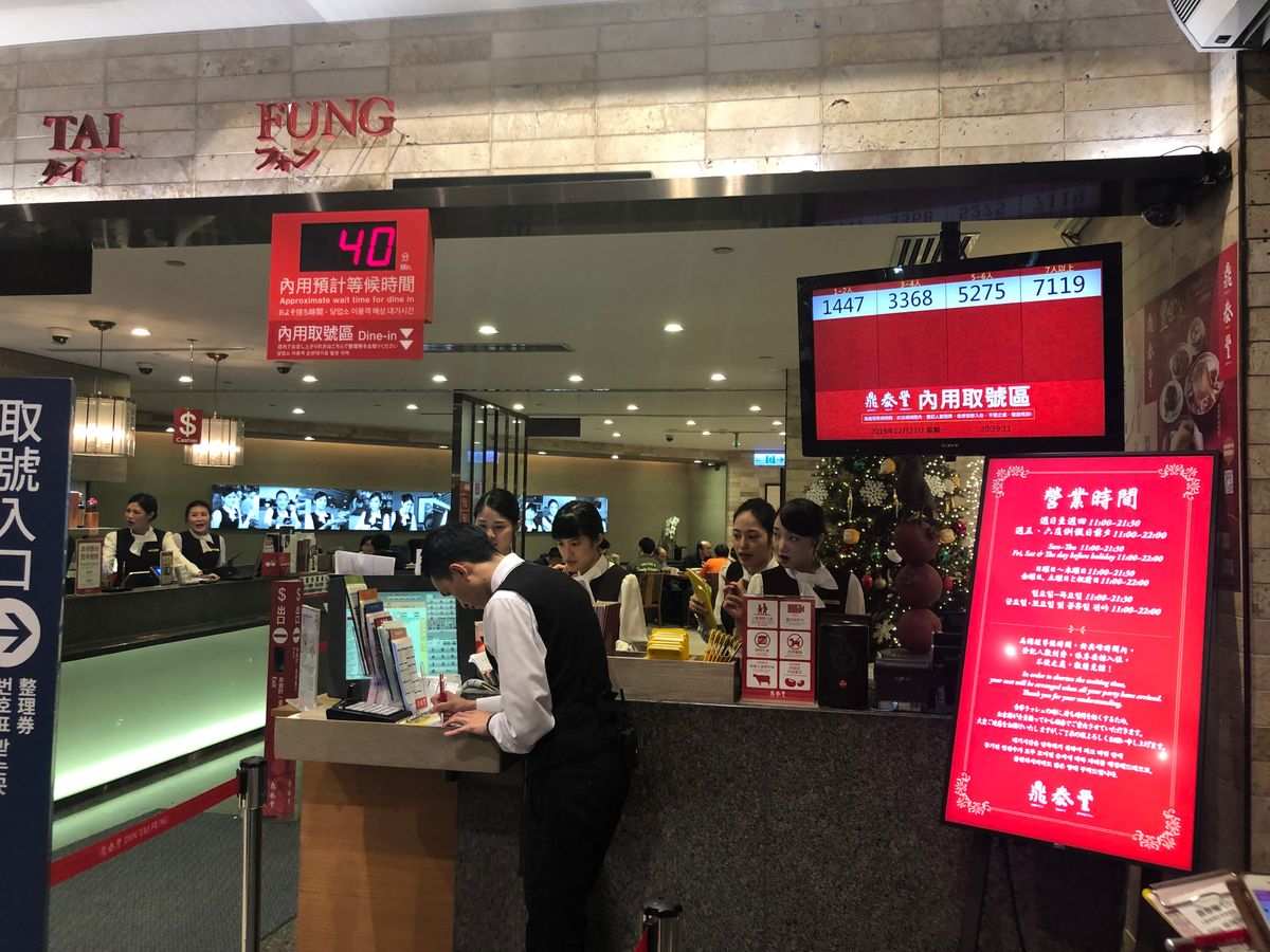台北101店に19時頃入店し、その時点で整理券発行は40分待ちでした。バウチャーを見せたところ15~20分待ちとメモされ、その場で待っててと言われたので待っていましたが、30分過ぎても案内されなかったので受付に声をかけたら「すぐ」との返答。しかし、なかなか声がかからず、結局40分くらい待ちました。これなら普通に整理券取って、待ち時間に周辺のお店を見たり、お料理を好きなものを注文したほうが良かった。