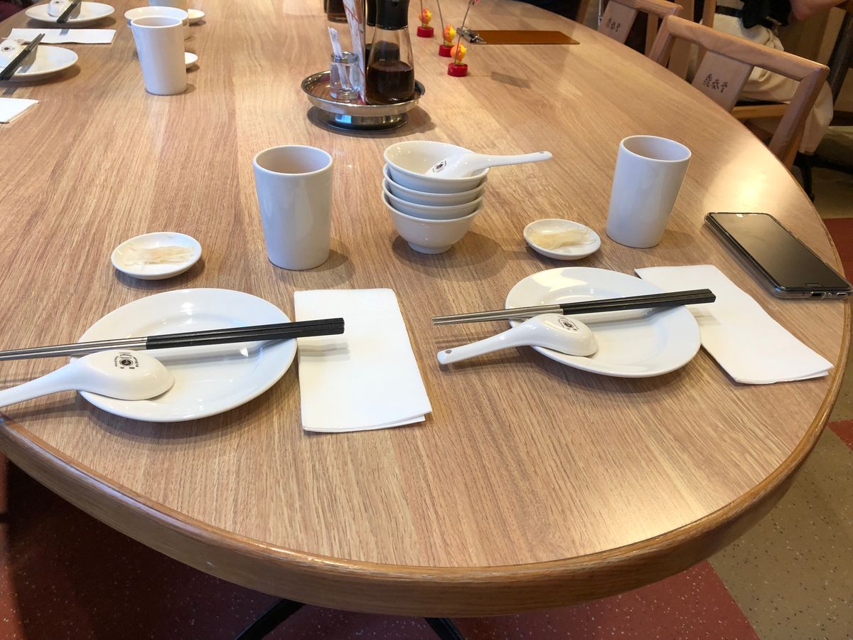 店前では数十人の客が待っていましたが、予約票を店員に提示すると10分ほどで優先的にお店に入って席に着くことができました。ちょうど6人掛けのテーブルに案内され、小龍包のコースがたちまちに給仕され始めました。急いで客をさばかなければならないという意識が伝わってきてしまい、ちょっとせかされて食事する感じではありました。