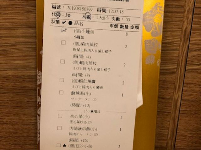 まず最初にテーブルに案内され伝票を置かれます。しばらくで小籠包の登場です。順番に運ばれてきて、伝票にチェックを入れていきます。食事の内容は外れなし、安定のおいしさです。日本と比較するとお安いです。