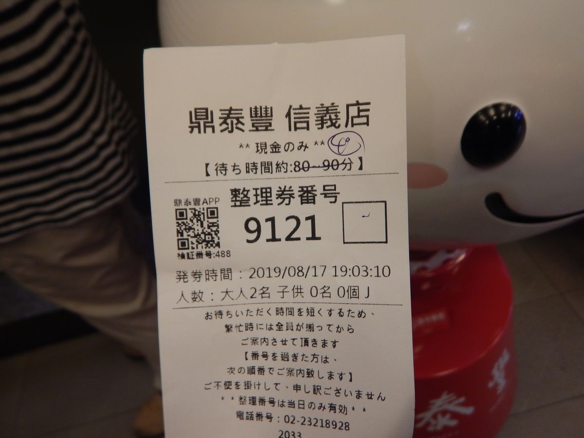 台湾といえば小籠包。有名店は行列が出来ていて暑い中待っているのは大変だと思いこの事前予約をしました。当日夜の19時ごろお店につくとお店の前は順番待ちの人だかり。でもこの事前予約券を見せると3組目くらいに通してもらいました。待ち時間は5分程度です。