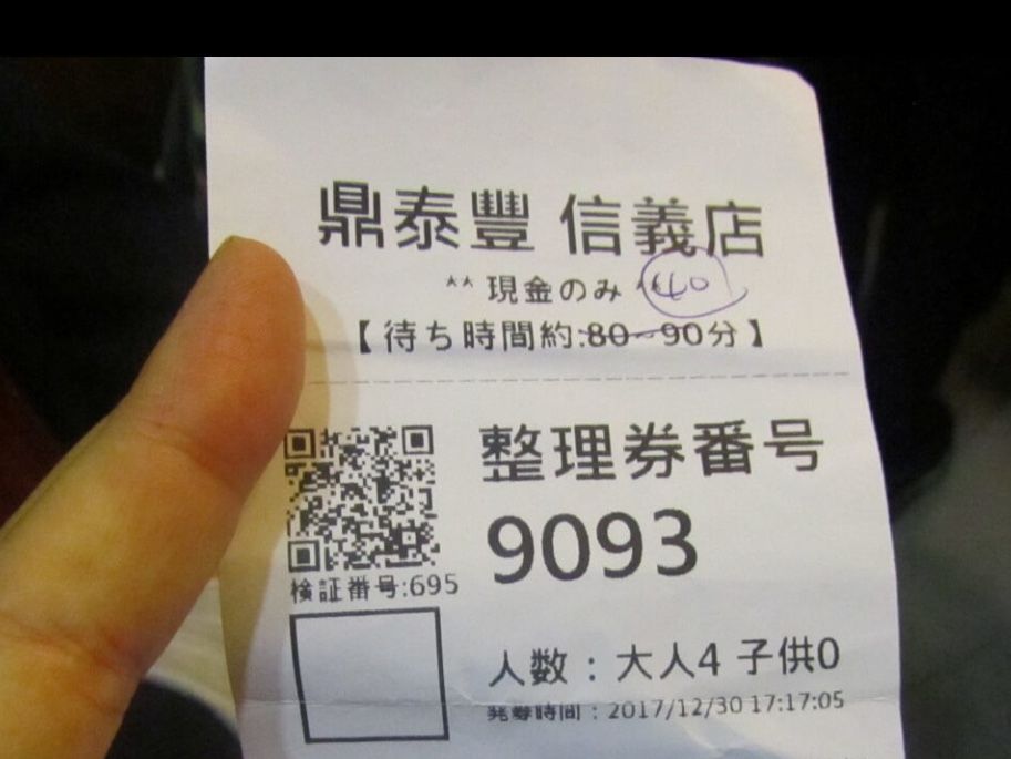 12/30土曜日の夜という一番混雑しそうな日時だったので、嫌な予感がして1週間前に17:30で予約を入れました。当日は台湾旅行初日。17:15頃に店に到着すると、すでに店頭はものすごい人集りでごった返しています。さすが永康街の本店です。店入り口にある待ち時間表示は90分。店の人に声をかけるのもはばかれるような状況で、JTBのバウチャを取り出して少し途方にくれて見ていると、後ろから来た店員の女の子が覗き込んで、それをよこせと受け取ると、40分待ちと書き込んで紙を渡され、少しホッとしました。付近を少しぶらぶらして買い物をして無事入店。小籠包、海老餃子、海老焼売、肉野菜餃子、炒飯、酸辣湯(サンラータン)、野菜炒め、こし餡薄皮包み、台湾ビールも追加で頼み、家族4人でどれも美味しく頂けました。店を出た19時過ぎにには待ち時間が120分になっていました。ありがとうございました。