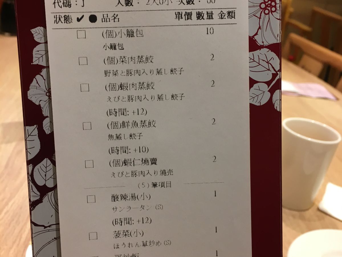 私の場合、予約時間の10分前に受付のお姉さんに印刷したクーポンを渡したらそのまま2階席に行けとクーポンを挟んだ伝票を渡され、待ち時間0(ゼロ)、2階でもすぐに席に通され、待つことほんの数分でメニューがレシートとして卓上に置かれました。セットメニューの中身がここで分かります。あとは、小籠包10個(2人前)から続々と他のメニューに進んでいきます。最後にデザートが運ばれ終了。会計を確認したがそのまま帰っていいと店を後にしました。全体の流れはこんな感じです。
