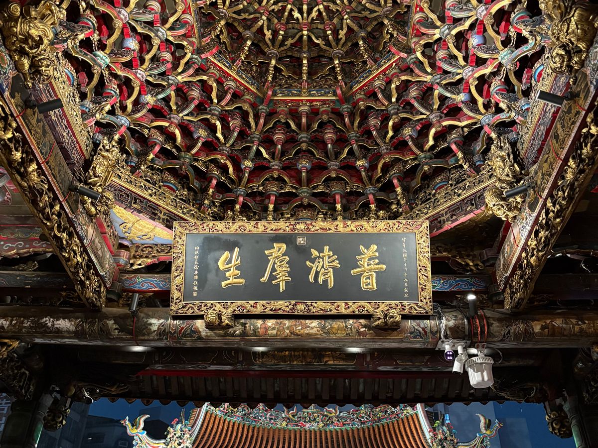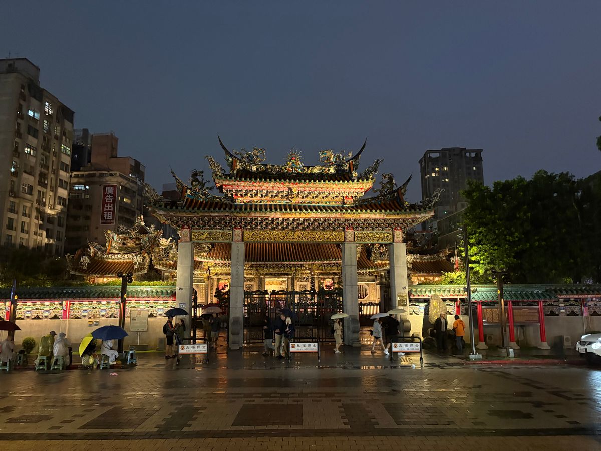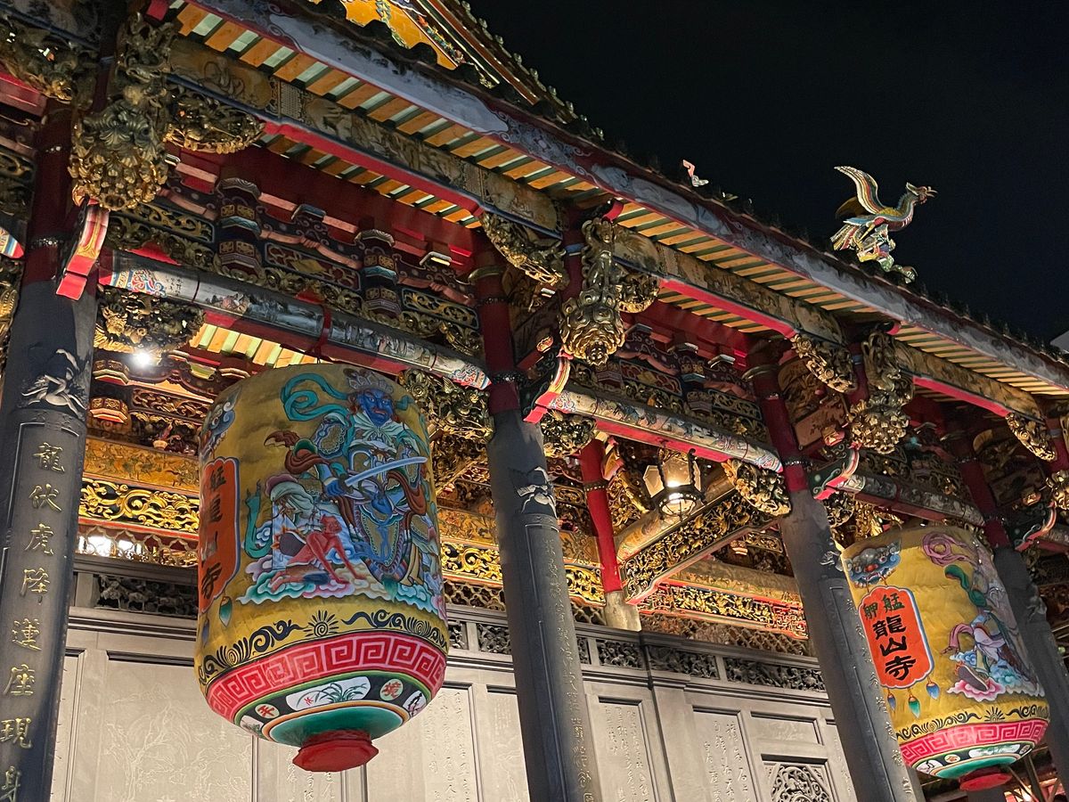 龍山寺散策当日は小雨。雨露の恩恵か、ライトアップされた屋根の装飾がより優美に映りました。