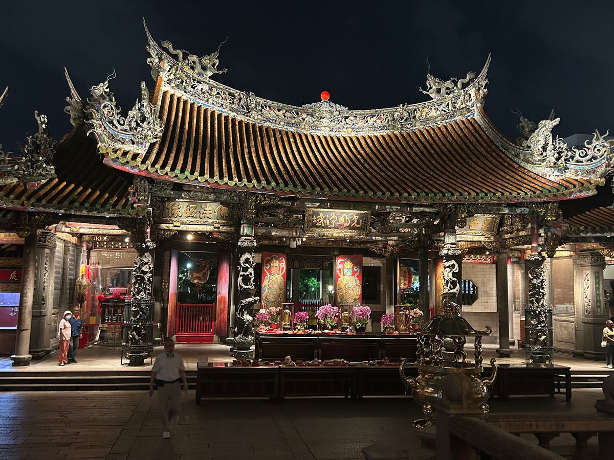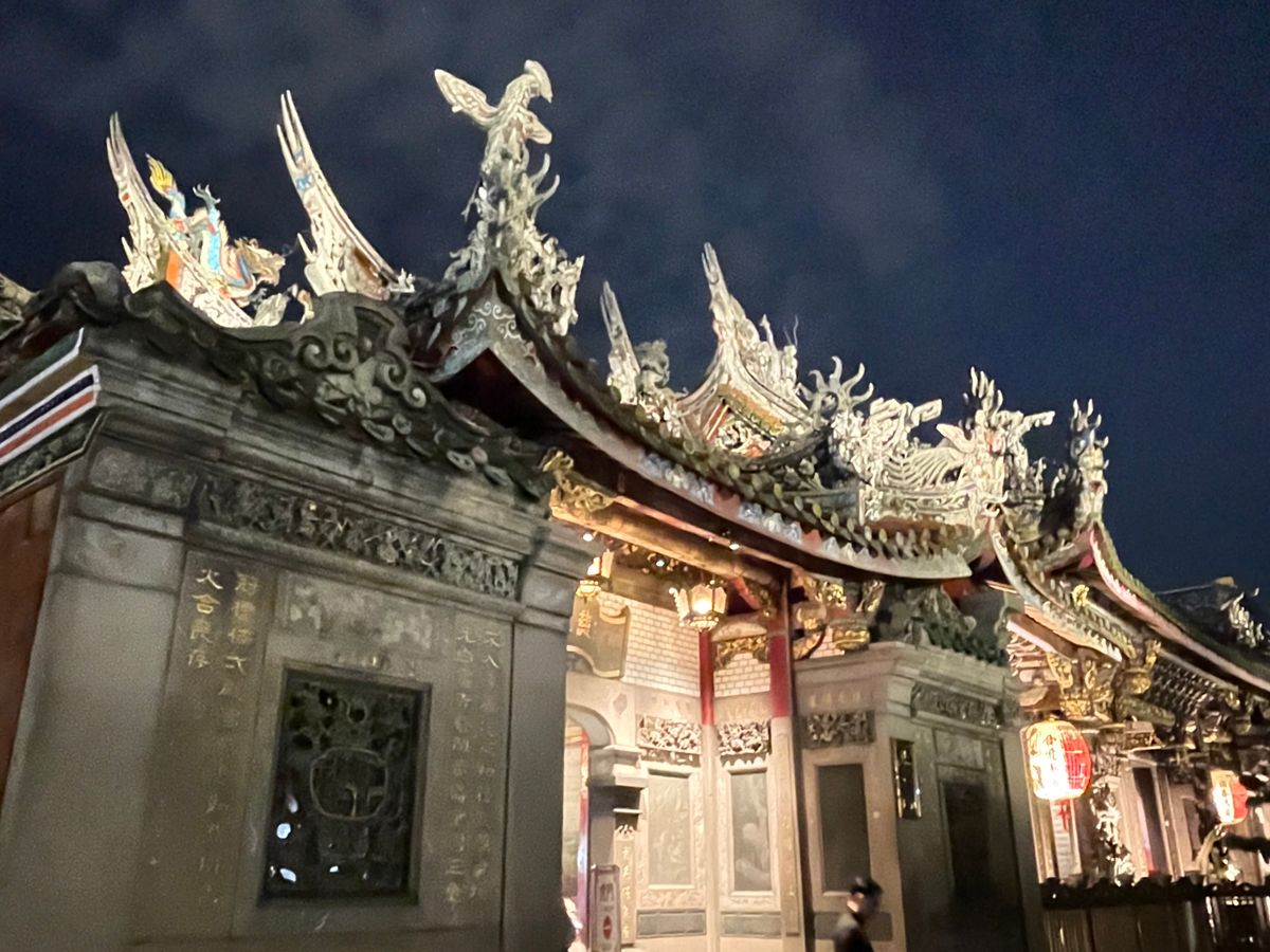 龍山寺散策当日は雨でしたが、ライトアップされた屋根の装飾がより優美に映りました。