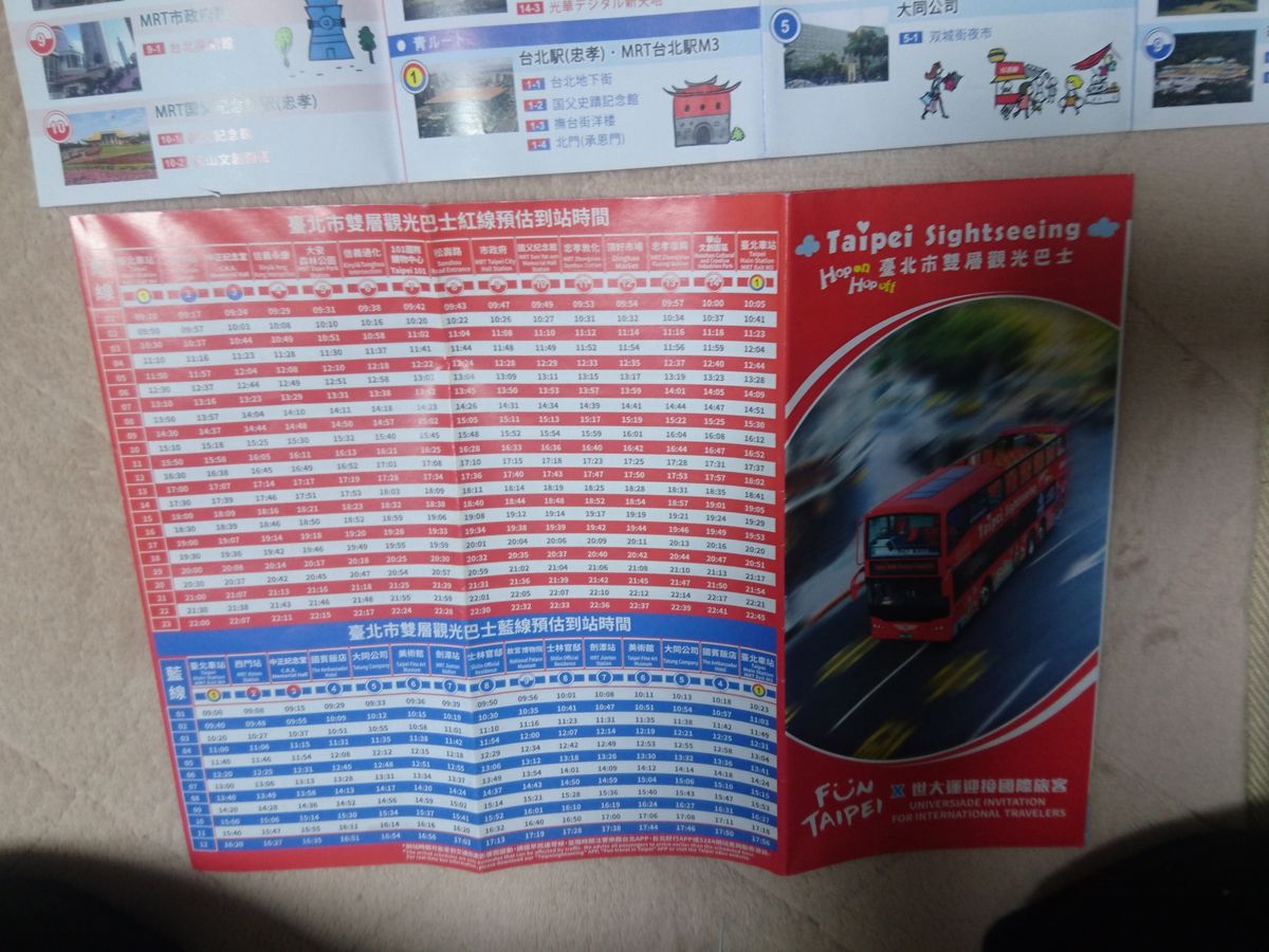 早めのチェックインでホテルに荷物を置いてから歩いて始発駅に向かいました。始発の台北駅には可愛いガイドさんがいて、チケット有りますかって声をかけてくれます。そこに行けば当日でもチケット購入出来るようでした。ブルーラインで忠列士と古宮博物館に行きたいのですが、ルート的には市内を回ってからそちらに向かいます。観光気分が盛り上り楽しいです。ただ時間がなかったので美術館前で降りて、タクシーで忠列士に向かい16:00の交代式を見ました。そしてタクシーで博物館に行きました。博物館も入館が17:00迄なので急ぎます。親切なタクシー運転手さんがどうやら時間がないから飛ばすよ的なことを言って素晴らしく短時間で到着!入館チケットも難なく購入、一時間見て回りました。博物館のブルーラインの最終便17:30にも間に合いそのまま夕暮れの台北駅に戻りました。バスを降りるとそのままそこで数分待ちレッドラインのバスに乗り替えます。途中まで昼間と同じコースを走りますが今度は夜景がきれいでまたまたテンション上がります❗その時、私達しか乗っていなかっので案内の放送を日本語で流してくれました。それまでは、イヤホンをもらってそれで日本語訳案内を聞いていたので、その気配りに嬉しくなりました。バスの中にはやはりガイドさんがいて降りるバス停を前もって聞いてくれるので乗り過ごすこともありません。行先を聞いて、どこで降りると近いとか、ここからなら直通のバスが出てるとかも教えてくれました。101で降りて観光。ホントは夜市にも行くつもりでしたが、さすがに飛ばし過ぎて疲れてしまいそのまま帰りのバスに乗って台北駅迄帰りました。市内のレッドラインは22:00代まで走っているので慌てないで済みました。