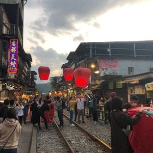 十份は駅の線路沿いに食べ物屋と土産物屋と天燈上げ屋が並び賑やかです。