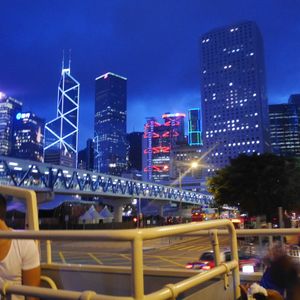 オープントップバス夜景ツアーでは、集合場所がわかりづらいので、シンフォニー・オブ・ライツが終わったら、早めに移動することをお勧めします。街中のため人がとにかく多く、思った以上に時間がかかります。バスには後ろから2列目に座ったのですが、ガイドの声がほとんど聞こえず残念でした。ただ、後ろの方が景色全体を見渡せるので、善し悪しです。約20分間乗車し、香港の街並みを満喫できました。以前よりネオン看板が減ったそうなので看板にぶつかりそう!という迫力はあまりありませんでした。