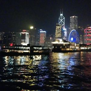 帰りのピークトラムも時間に関係なく利用できましたが、優先入場ではないので結構並びました。下山後公共のバスで中環まで行き、ツアーに付いていたスターフェリーの乗船券を使って、(今回は間違えずに2階席に乗船)尖沙咀まで帰りました。スターフェリーも時間に関係なく利用できましたので、船上で香港島側と九龍半島側のロマンティックな夜景をたっぷりと楽しめました。