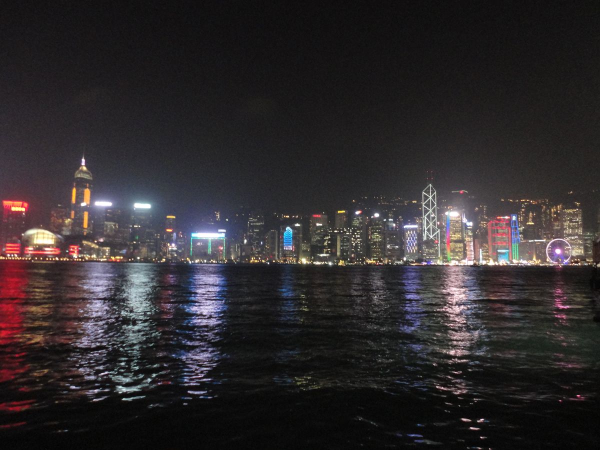 2月という時期的なこともあってか、ヴィクトリア・ハーバーは全体に霧がかかっていて光ももやもやとしていました。ガイドさん曰く、10月11月が最も良いコンディション、とのこと。高層ビルは上の方は霞んで全く見えませんでした。また、ちょうど旧正月中であったためか、お正月風のしょぼい光が点滅したりしているビルが多く、レーザーは2,3本がたまに見える程度で、期待外れでした。ショーが始まっているのか否かもよくわからないほどでした。音楽に合わせてレーザー等での演出を期待していたのですが、音声は船内放送の音質の悪いテープのようなもので、しかも音楽と光が無関係だったように感じられました。ウェルカムドリンクは、冷たいものと温かいものが選択できるというチケットを渡されましたが、温かいレモンティーを注文したところ紙パックの常温のもので、こちらも残念。