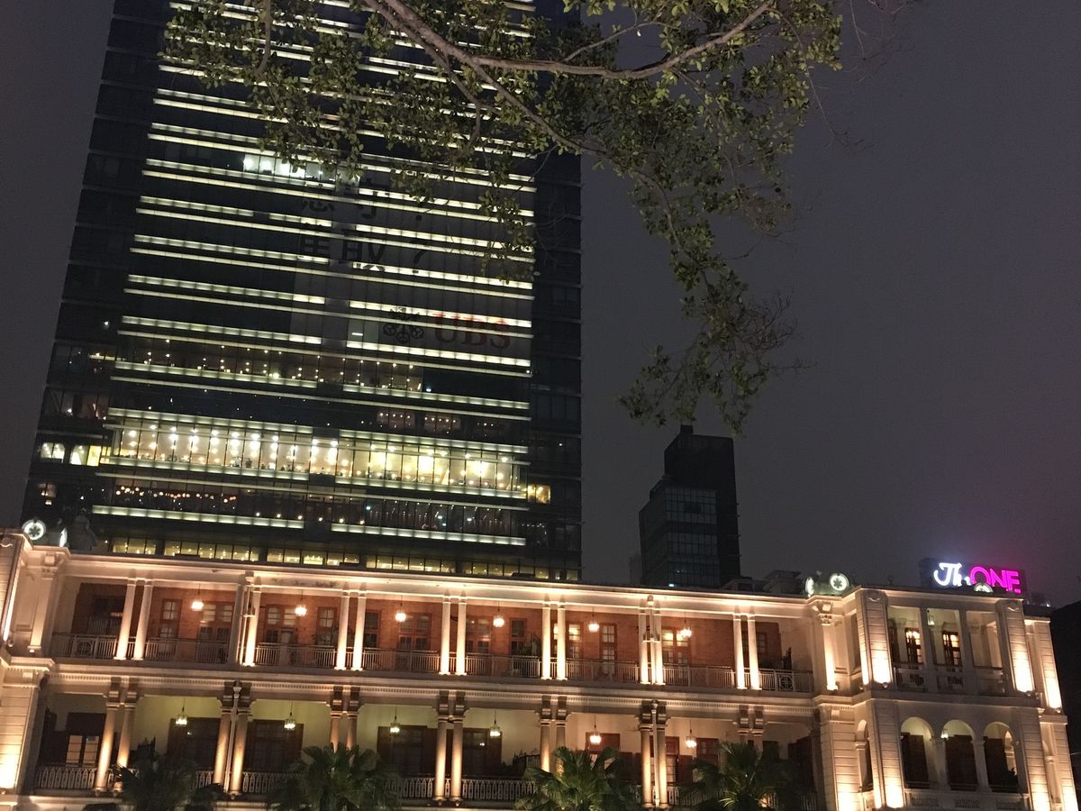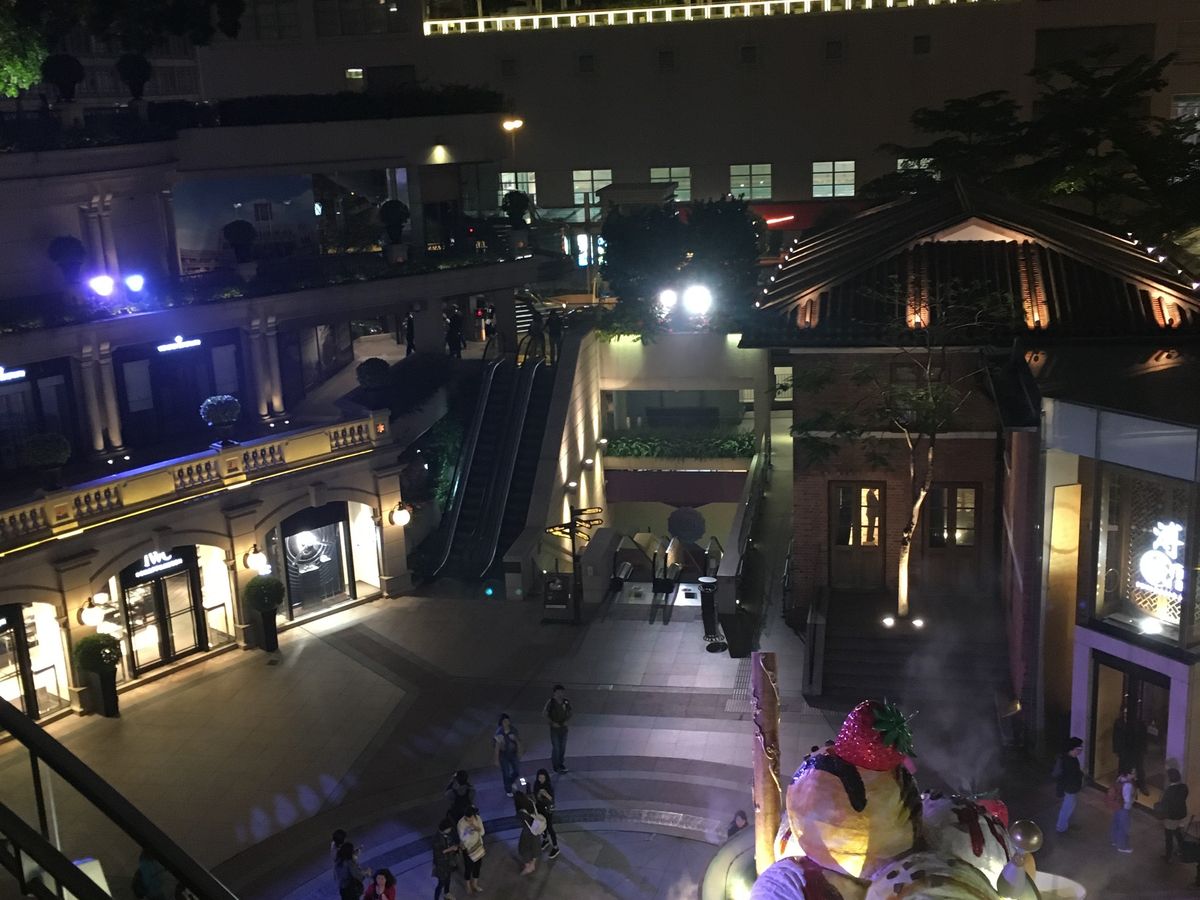待ち合わせ場所のホテルでガイドさんと合流し、徒歩で1881ヘリテージへ。見どころを案内してもらいました。だんだん暗くなり、歴史的建造物に光がともっている様子はきれいでした。