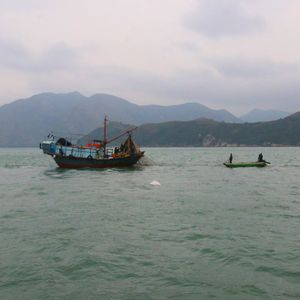 帰りに漁をする漁船の周囲で数回イルカの姿を見ましたが、一瞬でかなり遠く、望遠の一眼レフカメラでもイルカの写真を撮るのは無理でした。大澳からの小型ボートが数隻、漁船近くでイルカを見ていたので、この日はそちらの方が正解だったかもしれません。