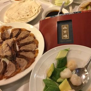 前菜、スープ、海老の炒め物とすすみ、こちらも負けずとビール、ワインと杯を重ねていると、本日のメインイベントの北京ダックが登場!過去中国等で食べたものとは違い肉が厚く付いている。50歳代の夫婦二人では少し量が多いかもと思いつつも、美味しさのあまり完食してしまいました!さらにその後も牛肉の炒め物、蒸し餃子、麺料理と続きますが、さすがに麺料理のところでギブアップ。でもデザートは別腹でおいしくいただきました。
