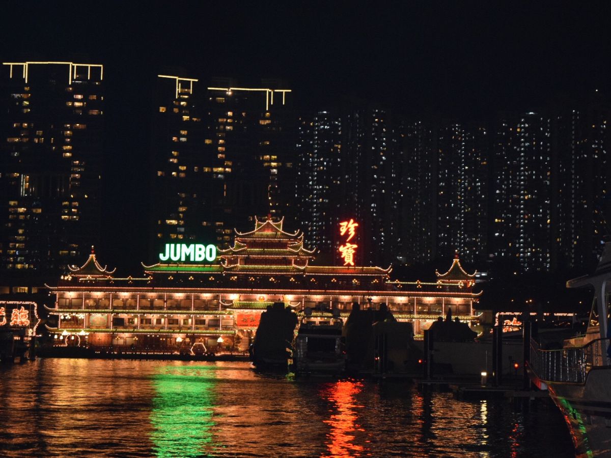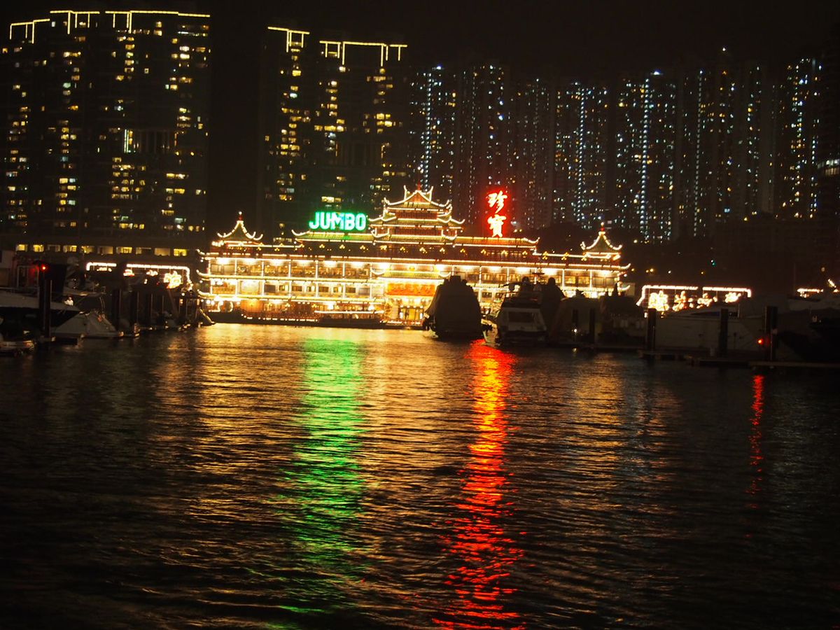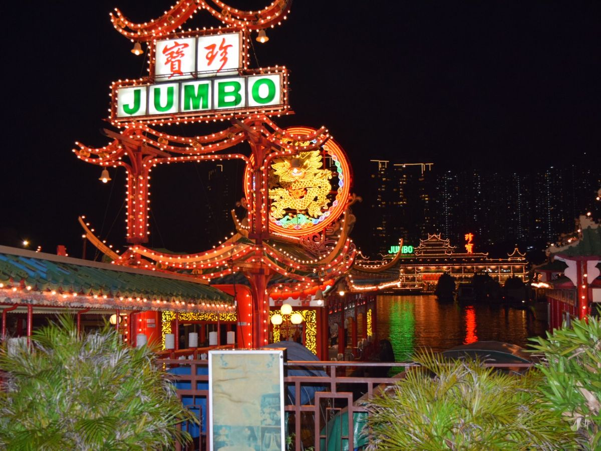 ジャンボ・キングダムの贅沢ディナーに参加しました。ビクトリアピークはガスで10万ドルの夜景(笑)でしたが、長蛇の列の中、さほど待たずに頂上まで行けたのとバスガイドさんのトークが楽しかった。ジャンボ・キングダムはディナーも大満足でとにかくネオンが綺麗でした。