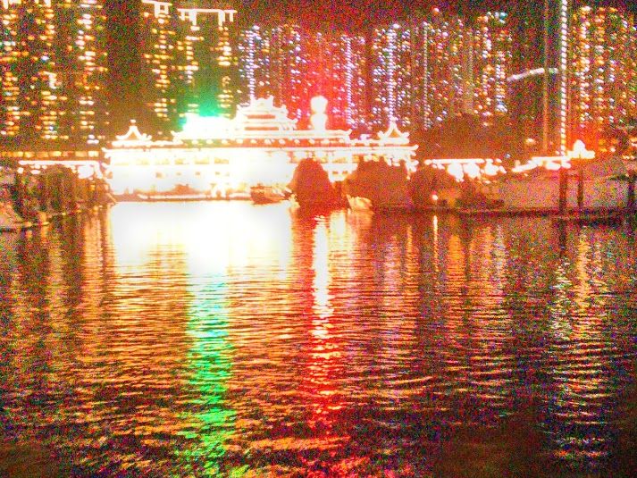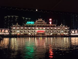 金曜日夜だったのでピ-ク・トラムは長い行列ができていましたが、優先乗車のためそれほど待たずに乗れました。運よく好天で200万ドルの夜景を見ることができ感激!そのあとジャンボ・キングダムで食事をしました。外から見るだけではなく、渡し船に乗って中に入ってこそ、豪華絢爛の別世界を体験することができます。食事もまずまずの美味しさで、デザートのマンゴープリンは特に気に入りました。