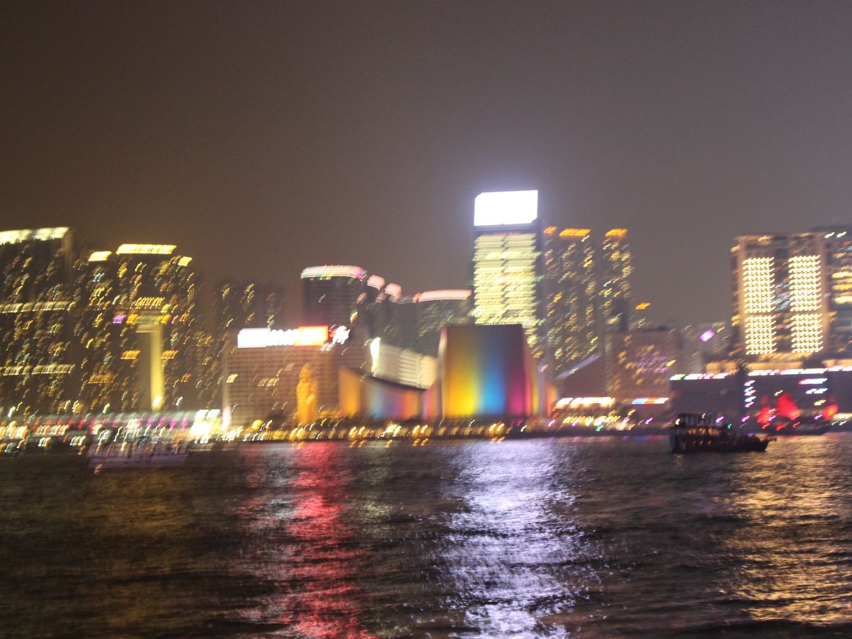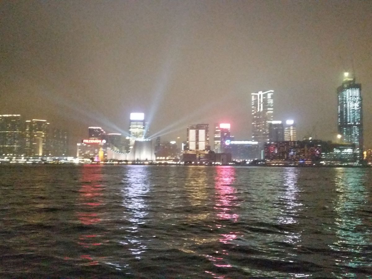 2月という時期的なこともあってか、ヴィクトリア・ハーバーは全体に霧がかかっていて光ももやもやとしていました。ガイドさん曰く、10月11月が最も良いコンディション、とのこと。高層ビルは上の方は霞んで全く見えませんでした。また、ちょうど旧正月中であったためか、お正月風のしょぼい光が点滅したりしているビルが多く、レーザーは2,3本がたまに見える程度で、期待外れでした。ショーが始まっているのか否かもよくわからないほどでした。音楽に合わせてレーザー等での演出を期待していたのですが、音声は船内放送の音質の悪いテープのようなもので、しかも音楽と光が無関係だったように感じられました。ウェルカムドリンクは、冷たいものと温かいものが選択できるというチケットを渡されましたが、温かいレモンティーを注文したところ紙パックの常温のもので、こちらも残念。