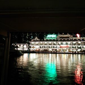 渡し船で行くジャンボは、電飾がきれいで楽しめました。食事をアップグレードしましたので、フロアもシックで食事も美味しかったです。ただ、団体ご一行様扱いで、同じツアーの参加者と1テーブルに相席でした(ファミリーとしては、特段の支障もなかったのですが、カップルさんには申し訳ない感じがしました。食事は大皿料理をテーブルに運ぶ前に小分けして持ってきてくれるので、1テーブルに限定する必要もなさそうな気もしたのですが…。空いてる席もたくさんありましたし…。)。