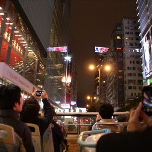 ことしの7月のはじめに、家族4人で参加しました。両親(70代)と私たち(40代)夫婦です。私たちは4回ほど香港に来ていますが、両親にとっては、はじめての香港なので「なにか香港らしい派手目なイベントを!」と考え、初日の夕食後にこちらのオープントップバスに参加しました。九龍半島側の中心地にある九龍ホテルのロビーが待ち合わせで、集合場所はわかりやすいと思います。私たちのほかに、3〜4組の日本人の参加者の方がいらっしゃいました。ガイドさんは、日本語がかなり堪能な方で、とてもてきぱきとされていましたが、道路渋滞でバスがなかなか集合場所に来なかったというアクシデントが発生して、15分〜20分ぐらい待ちました。これは、まったく、ツアー主催者側には関係ない話かと思いますが、このとき、このツアーに参加する若い女性の集団が、少ししかないロビーの椅子のスペースを陣取っていて両親はずっと立って待っていました。(ホテル側に、集合のためのスペースを借りられているようなのでそういう要望を出しても難しいとは思いますが)こういう事態にそなえて、座って待てるスペースがあるともっとよかったと思います。とは言え担当のガイドさんは、待たせているお客さんに対して、ほんとうに謝りっぱなしで、本当に一生懸命で笑顔を絶やさず、誠心誠意がんばられていました。大変だったと思います。バスに乗ってからも、ガイドさんのパワフルな働きぶりが印象に残りました。バスが遅れた分も、コースはカットしないできっちりやります、という説明もあり、所用時間は1時間。蒸し暑い時期ですが、かなりのスピードで香港の中心街を疾走するので、夜風はここちよいと思います。なにより、香港ってこういう感じの街、というのが、短い時間でよくわかるツアーだと思います。良い思い出になりました。お世話になりました!