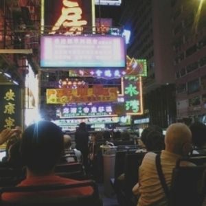 台風の影響でツアーが中止になるかもと思い電話をかけてみました。日本語を話せる方がでてとても助かりました。無事ツアーも出来ました。雨が降りそうだったのでバスに乗る前にカッパを貰いました。台風で飛行機が到着しない便が沢山あり参加者は私達家族(主人と子供9歳)とあと1組だけで一番前に座ることが出来ました。ネオンのついた看板すれすれの所を2階建てバスで風に当たりながら走ります。香港に来たなぁ~と実感できます。子供は大喜びですっと立ったまま乗っていました。途中でガイドさんが親切に何度も写真を撮ってくれて3人での写真が沢山撮れました。3人とも大満足のツアーでした。今度香港訪れた時も必ずまた乗りたいと思います。