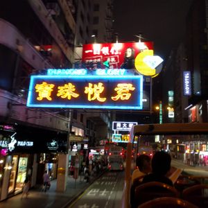 次に香港のネオン看板の街中をオープントップバスで疾走!雨もなく夜風に当たりながら気持ちのいいひとときでした。ガイドさんがわざわざ2階まで来て写真を撮ってくれたりサービス良かったです。