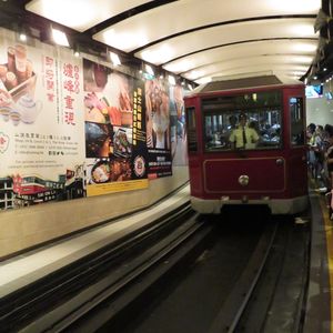 ピークトラム乗り場に着くとなんと!人、人、人のやまだかり1時間程並んで(優先だったのでまだまし?優先でなかったら2時間以上待つはめに!優先のツアーで良かった)2両編成のピークトラムに乗り急な坂を登り山頂へ!