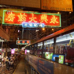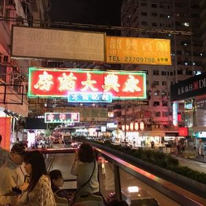 オープントップバスは、乗り込む時点で席順が決められていて、ほぼ満席だったかと思います。ほろ酔いの身体に、夜風がとても気持ちよく、高い位置からの眺めは最高でした。しかし、想像していたよりは、看板は少なく、看板すれすれ感のドキドキ要素は、まるで無かったです。降車して、女人街周辺を自由に歩け、夜の街で、少しショッピングができたのも、良かったです。夕食後のお散歩兼ねての参加に、とても、おすすめのツアーだと思います。
