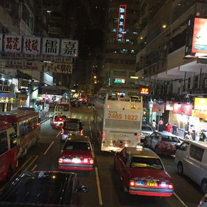 窓が開いていて心地よい風が車内に入り、夕暮れの香港街並みネオンも見られる。