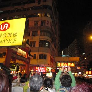 最初の観光地のビクトリアピークは、ピークトラム乗車客の超長蛇の列にビックリ!!でも、このツアーの参加者は優先的にトラムに乗車できるので約30分の待ち時間で済み、これだけでもこのツアーに申し込んだメリットがありました。山頂に着くとこれまたたくさんの人、人、人だらけでしたが眼下に広がる景色に感動しながら娘と写真を撮りまくりました。ガイドさんによると、この日の夜景は80万ドルだそうで、霧が多いこの時期にしたら遠くまで良く見えてラッキーでした。日没前から夜にかけての景色を小一時間ほど楽しんだあとは、アバディーンへ向かい水上レストランをバックに写真撮影。短い時間でしたが、ガイドさんも積極的に写真を撮ってくれました。その後、オープントップバスに乗り換えて夜の香港の街を小一時間ほどドライブし、私たちは宿泊先が近かったので最終目的地の女人街で下車解散しました。