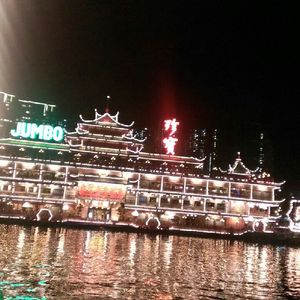 朝から天気の悪い日で、夜景は残念ながらガイドさん曰く満足度30%の日だったようですが、この幻想的なジャンボ・キングダムに到着し、船に揺られて移動している間に夜景の事は忘れていました!